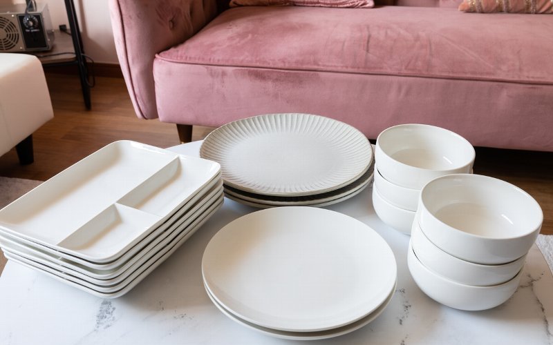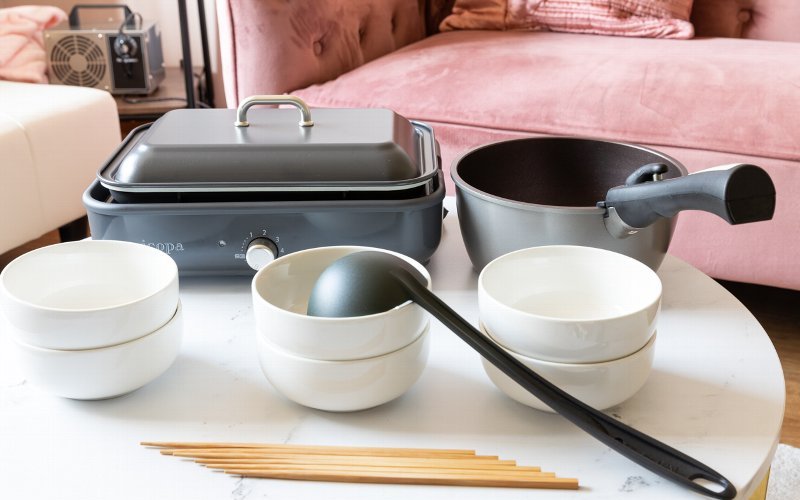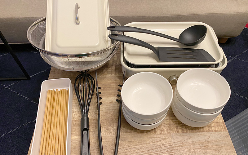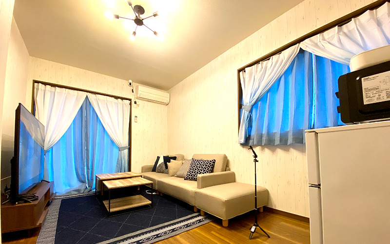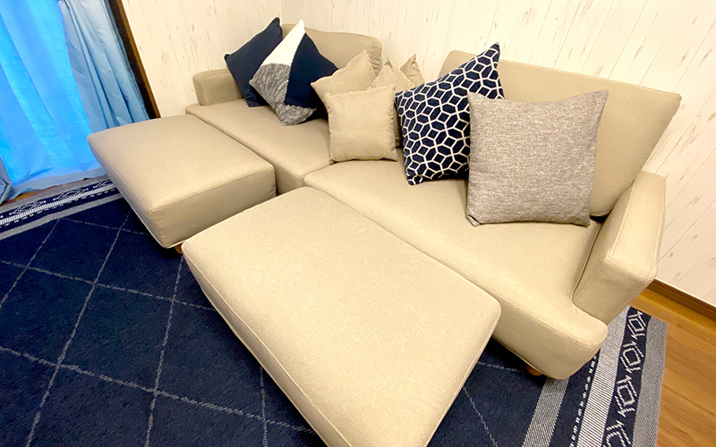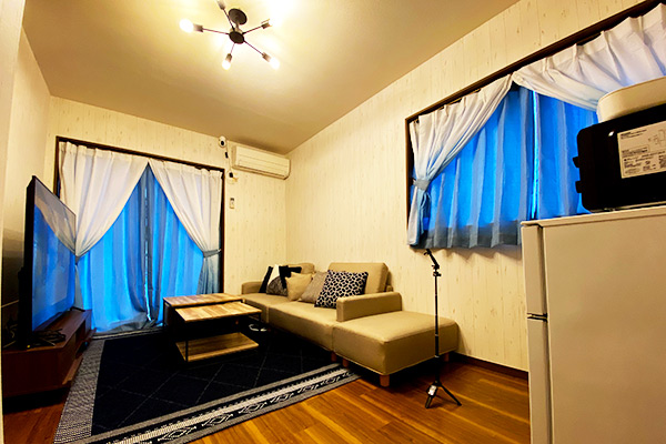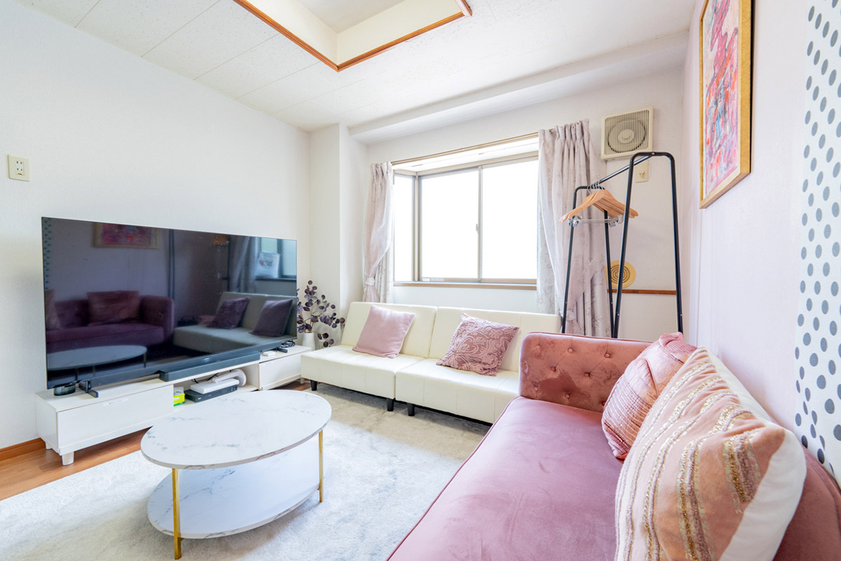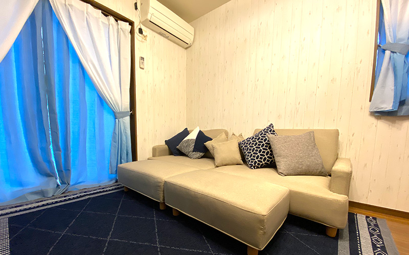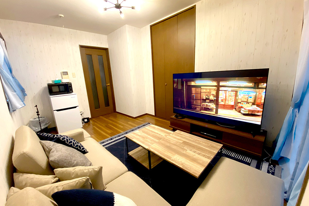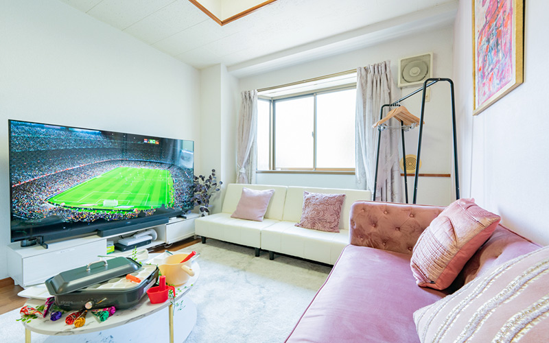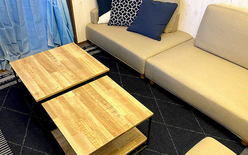 3人掛けのソファーを2台ご用意しているので、ゆったりくつろぎながら快適に過ごせます。広めのテーブルもご用意しているので、持ち込みパーティーや、会議などにも便利です。